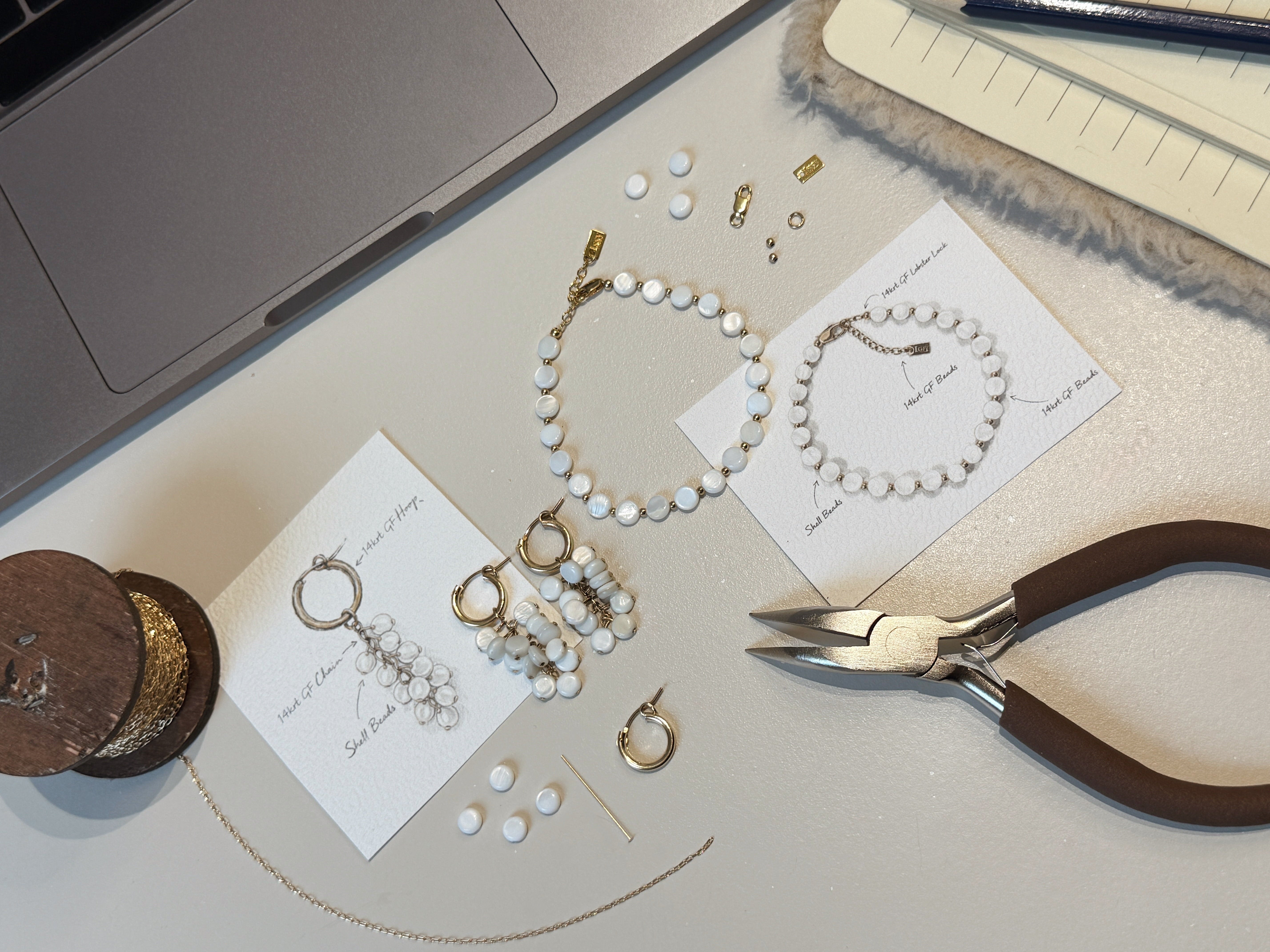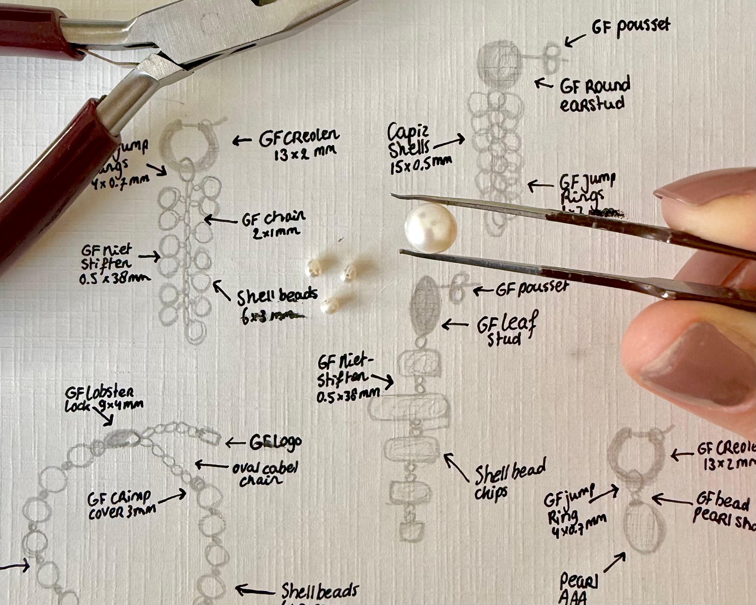 Elk sieraad begint met het vinden van de juiste materialen. Daarna schetst het ontwerp zich uit als technische tekening, zodat we precies weten welke onderdelen nodig zijn. Alles wordt vervolgens met de hand gemaakt, in duurzame kwaliteit die je een leven lang kunt dragen.