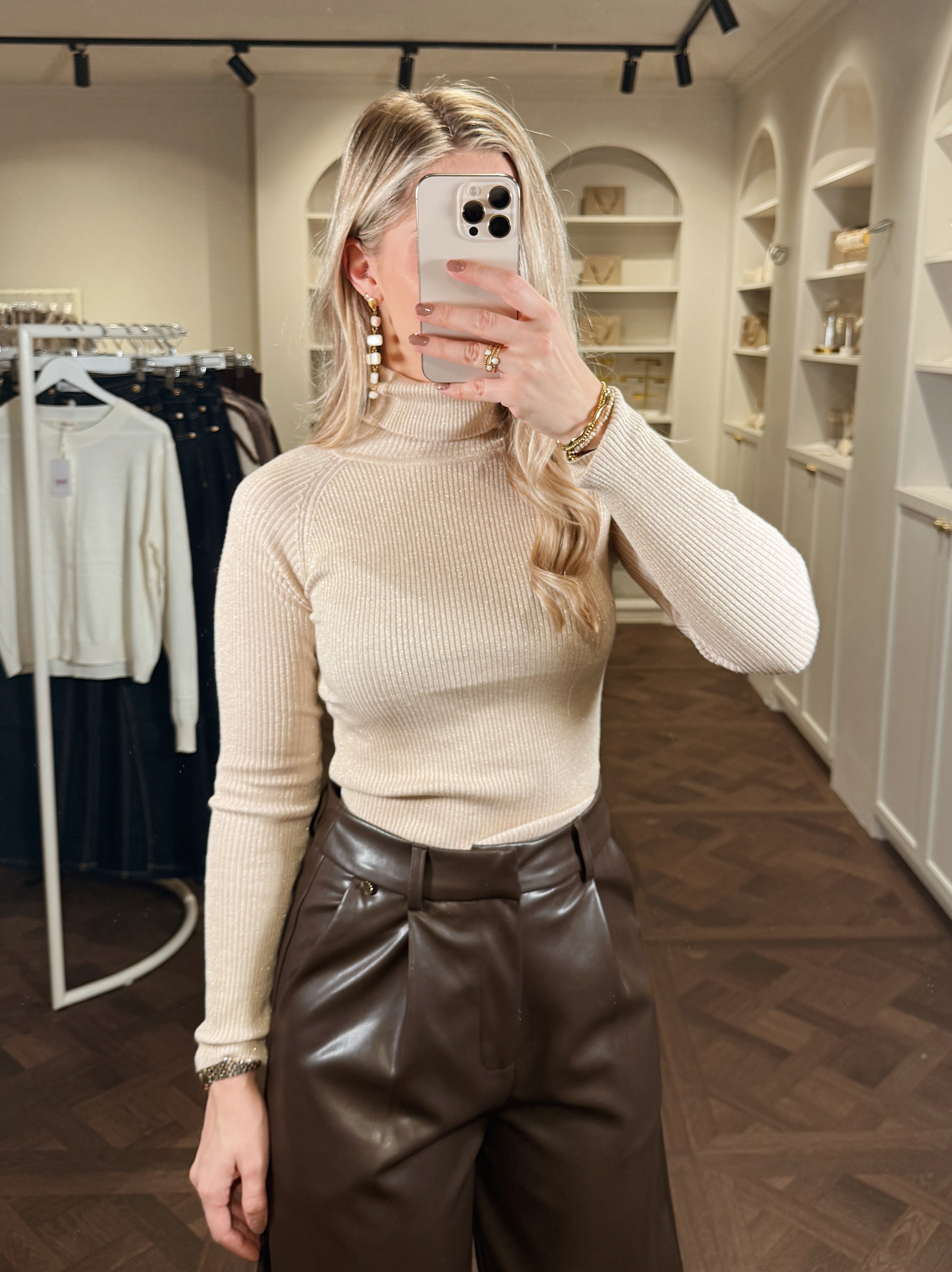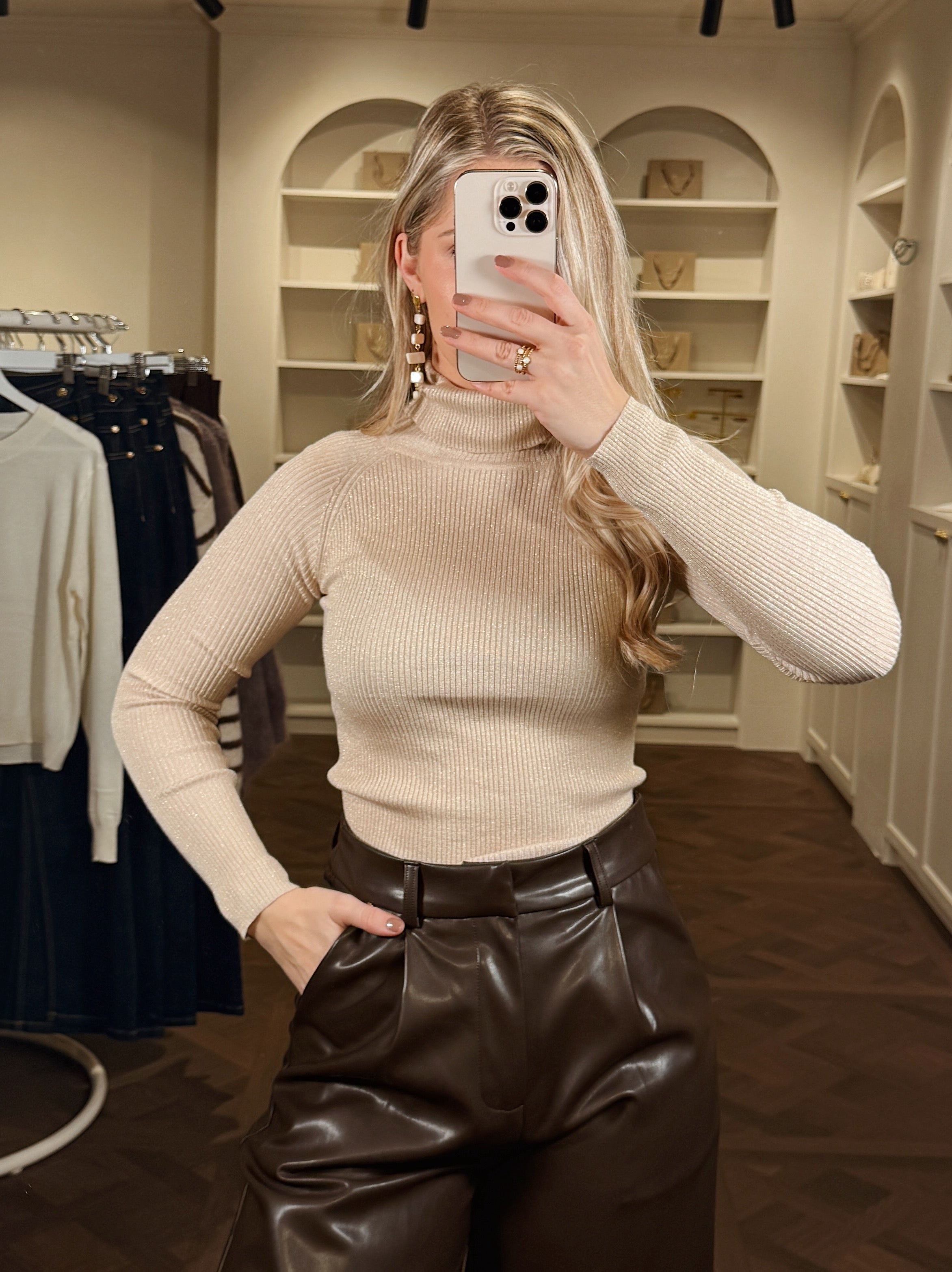 De Anna Col is een elegante beige coltrui met een verfijnd ribbelpatroon en een subtiele glitter die het licht op een zachte, luxe manier vangt. Dankzij de stretchy, aansluitende stof vormt deze top mooi met het lichaam mee — perfect als basis voor zowel casual looks als feestelijke outfits.