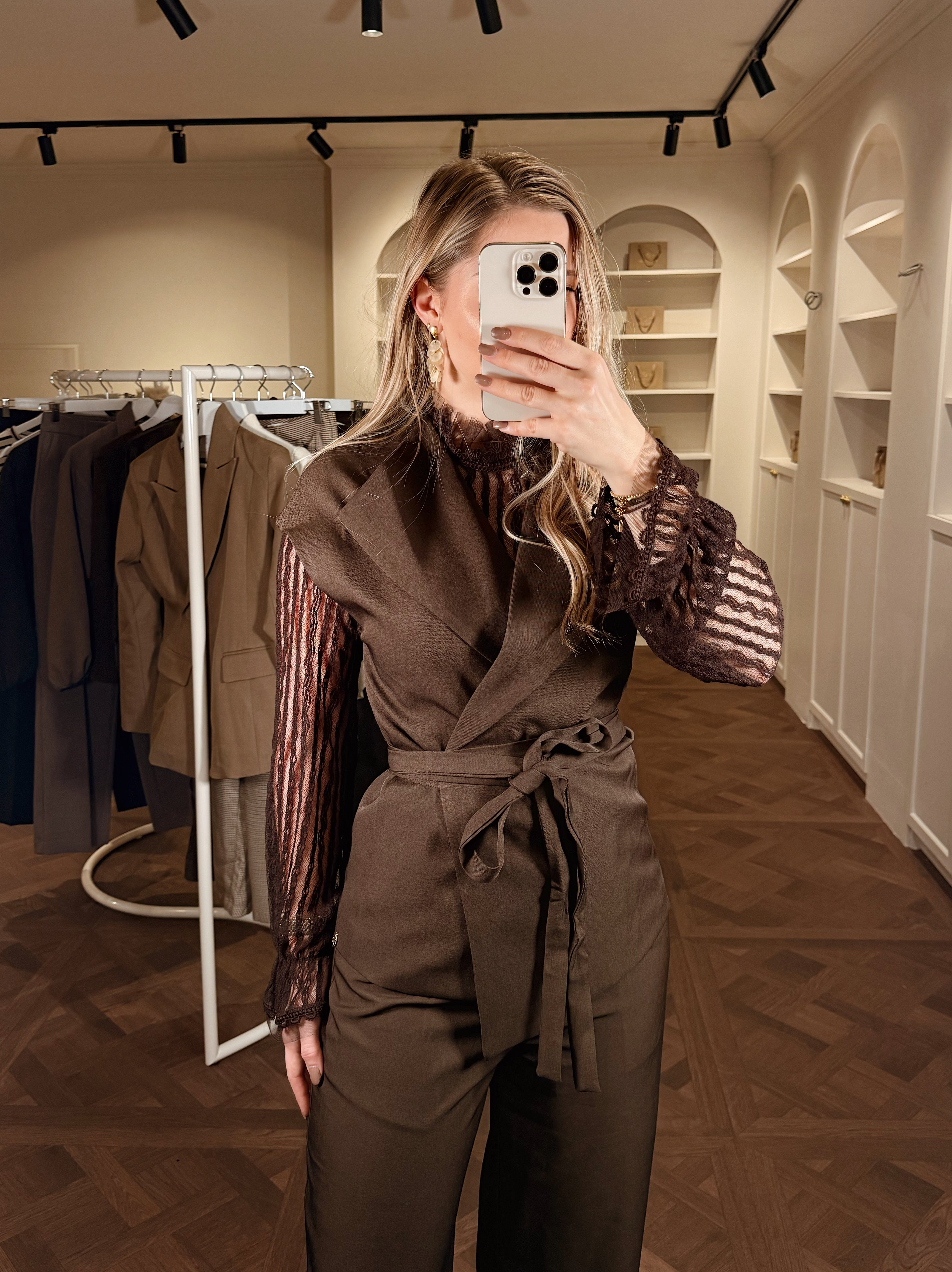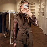 DelenDe Ayla Gilet geeft elke outfit een krachtige, vrouwelijke uitstraling. Het mouwloze ontwerp in donkerbruin kun je mooi tailleren met het bijpassende ceintuur, combineer met onze Ayla Pantalon voor een tof pak.