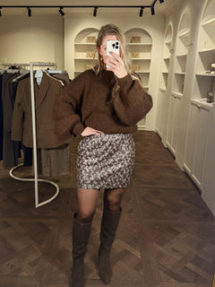 Ons Bea party rokje is een echte eye-catcher en ideaal voor festivals of andere feestelijke gelegenheden. Het rokje is volledig bedekt met pailletten in verschillende tinten bruin, wat zorgt voor een speels en opvallend effect. Dankzij het subtiele ritsje aan de zijkant sluit het rokje mooi aan op het lichaam.
