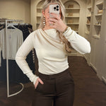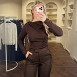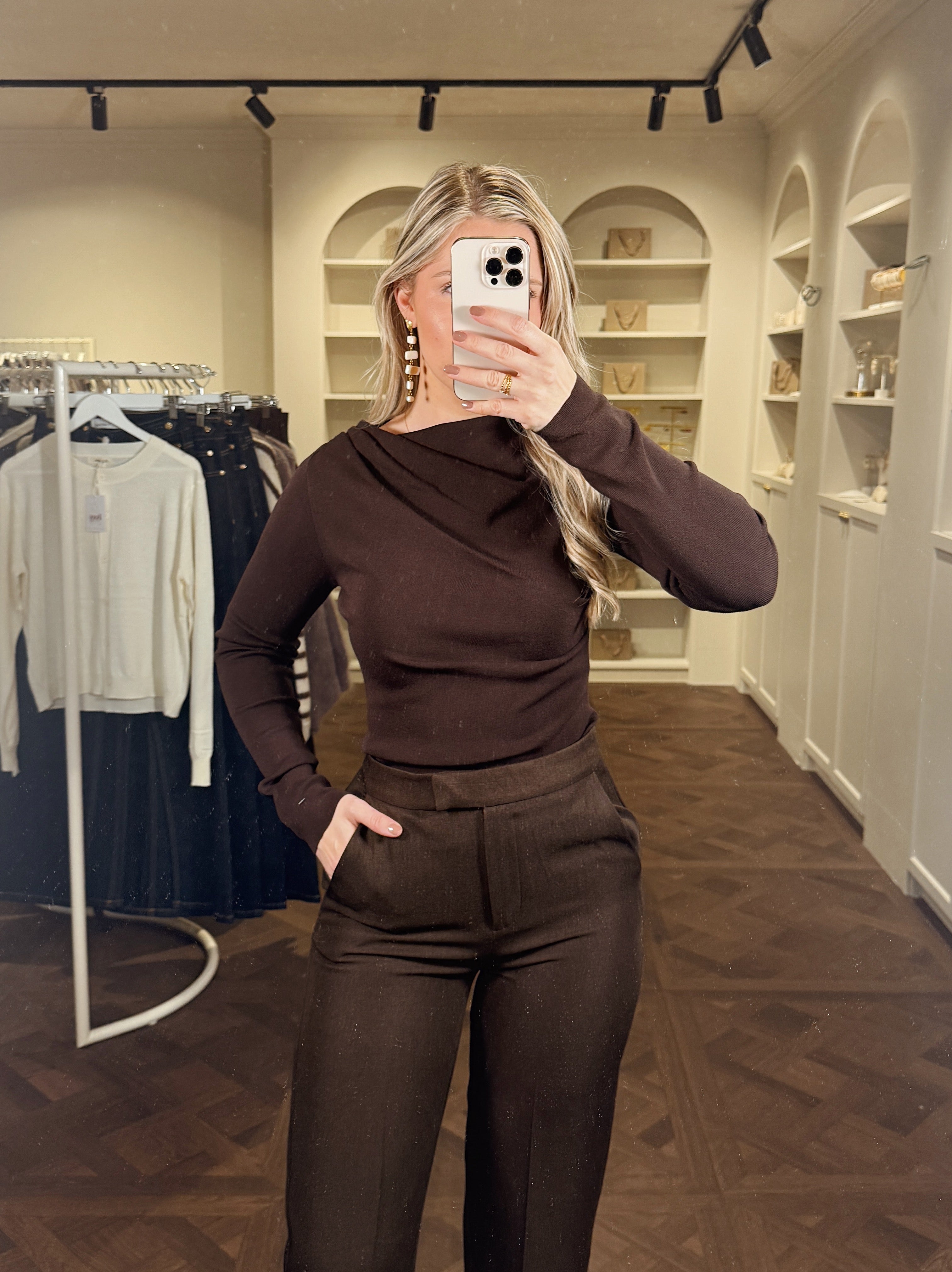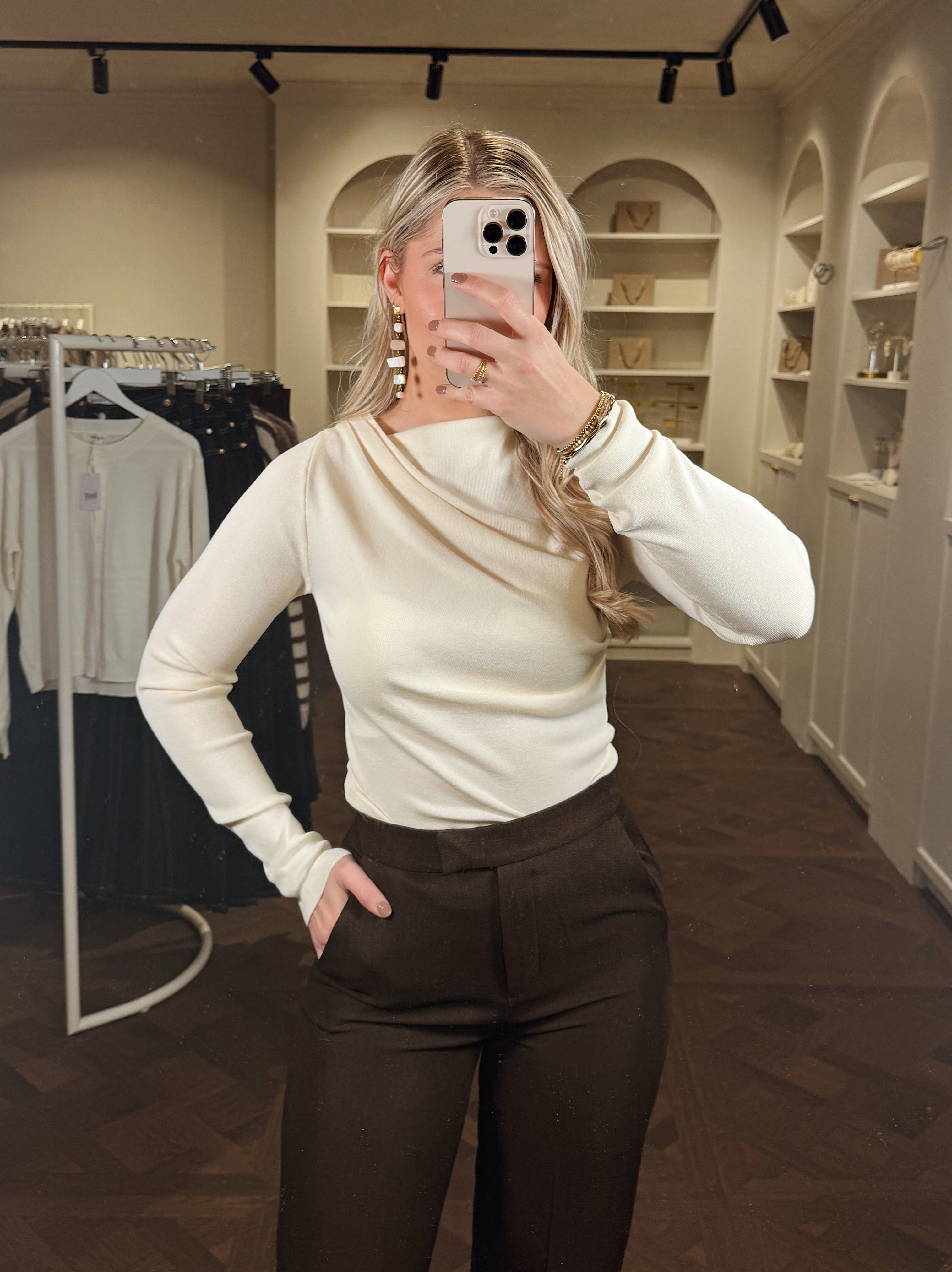 Deze asymmetrische top is gemaakt van een rijke, dikke stof die warm en luxe aanvoelt. De subtiele drapering langs de halslijn geeft de top een elegante, moderne uitstraling — perfect voor stijlvolle momenten of een chique everyday look.