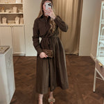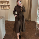 Kenmerken: Knoopsluiting, ceintuur in de taille, lange lengte