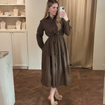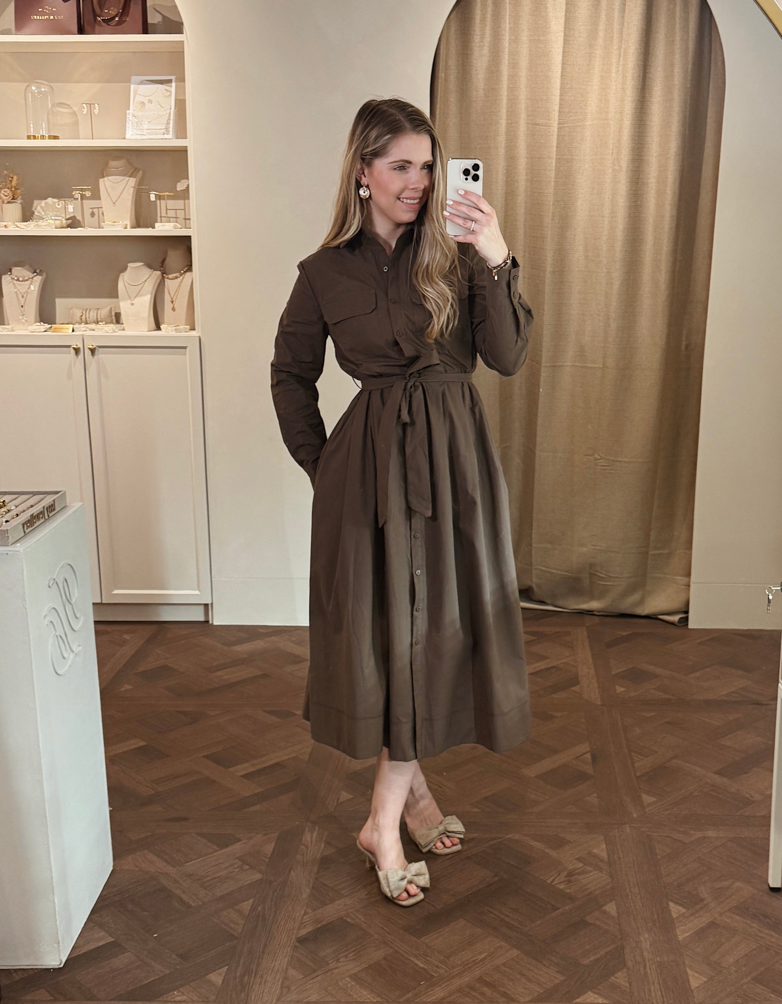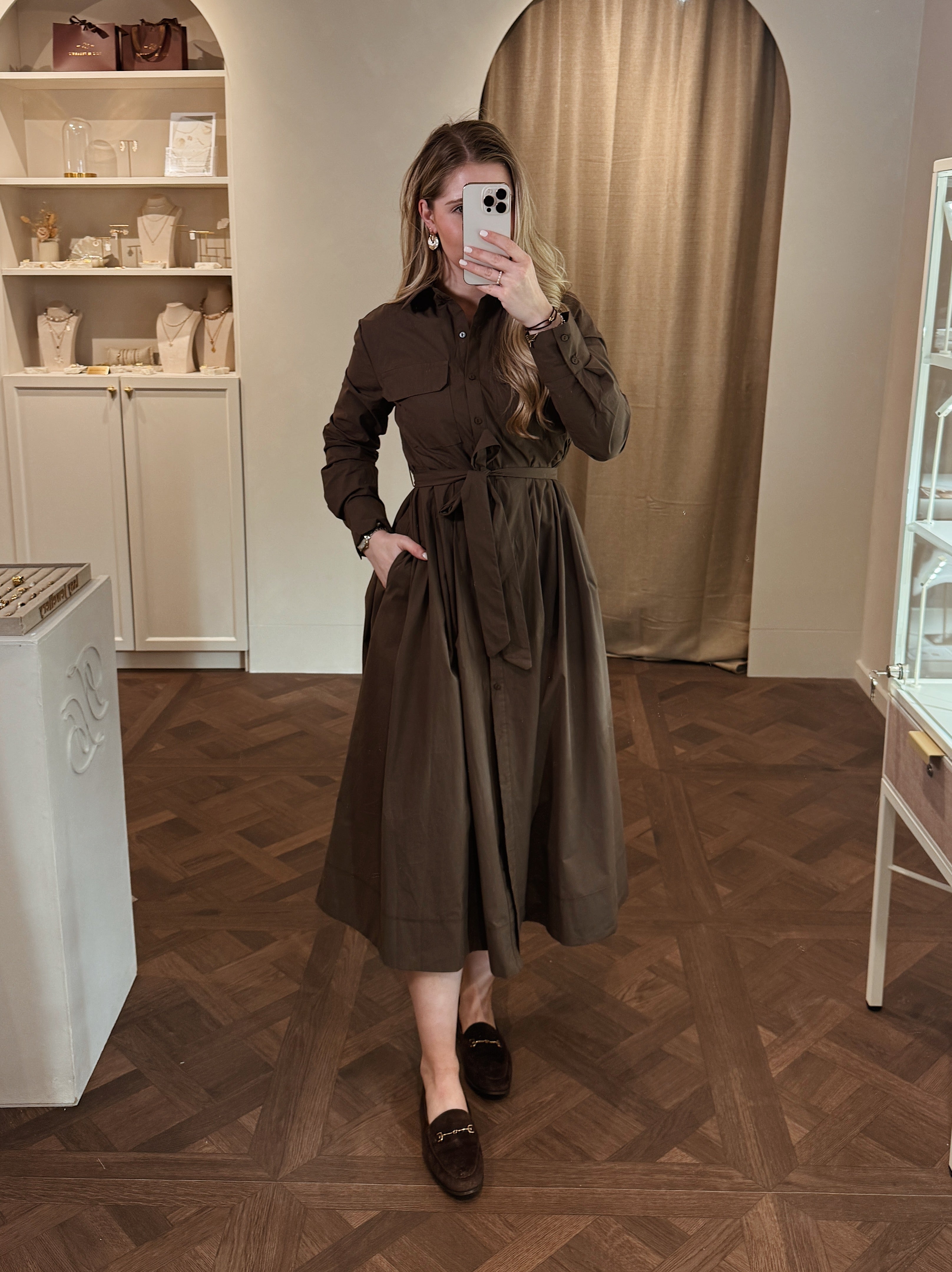 Onze Blake Dress is een elegante maxi dress in een warme khaki tint met een tijdloze uitstraling. De knoopsluiting en het bijpassende ceintuur zorgen voor een vrouwelijke, getailleerde fit, terwijl de luchtige stof zorgt voor comfort. Perfect voor zowel een casual als meer geklede look.