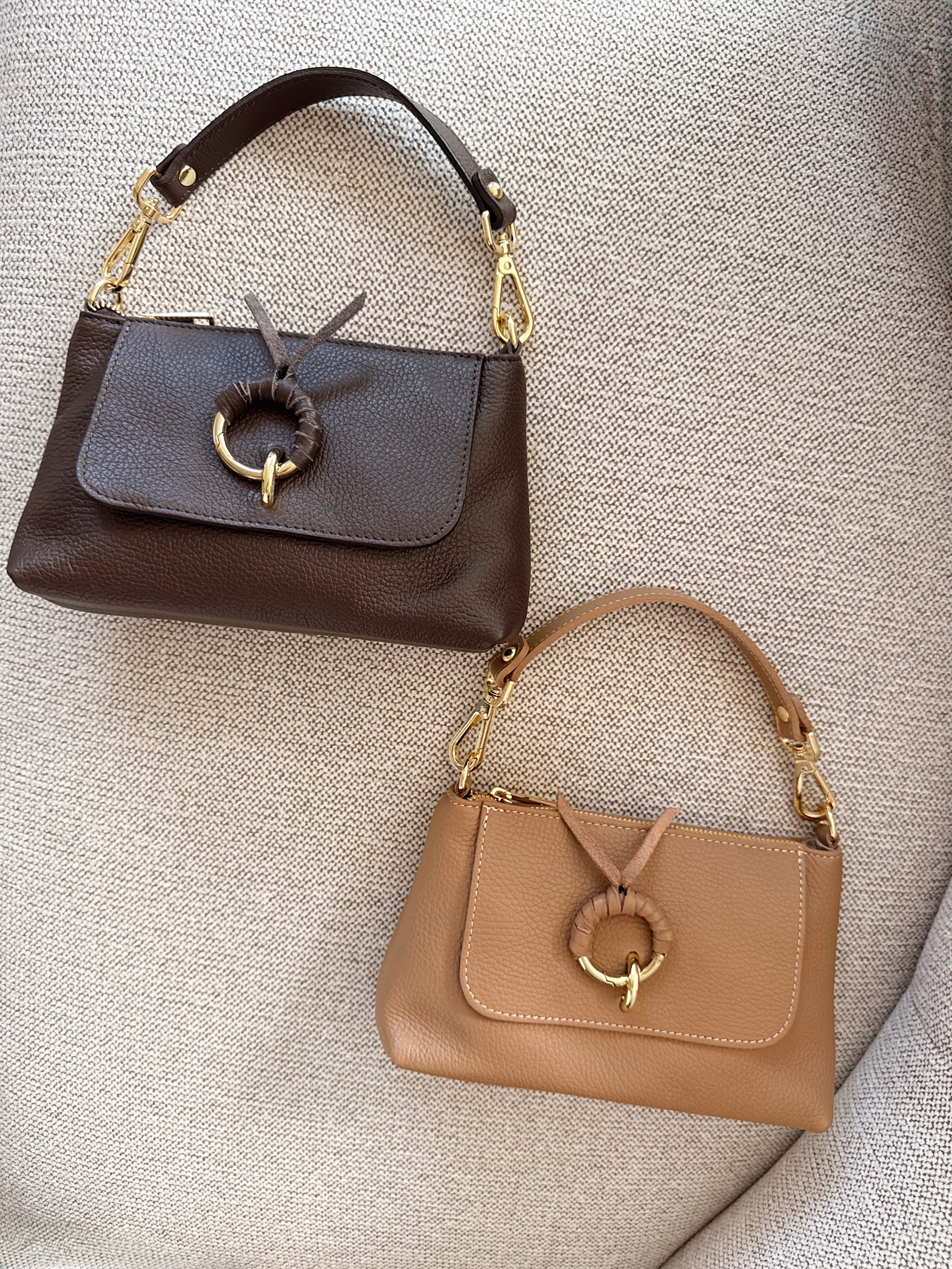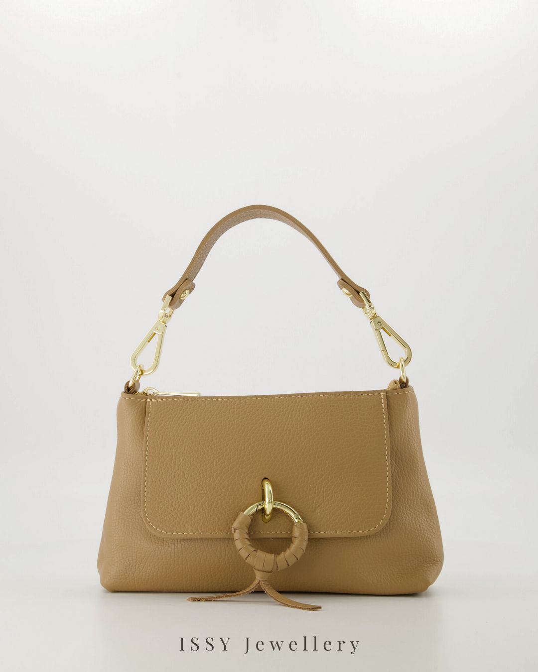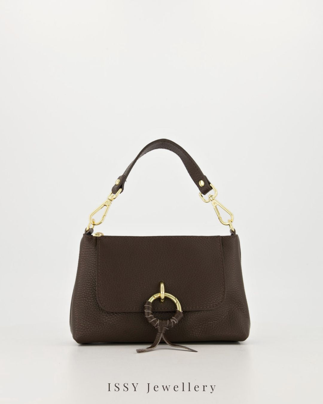 DelenDe Cosi Bag is een elegante leren handtas die ook als crossbody gedragen kan worden. Dankzij het afneembare en verstelbare hengsel kun je de tas op meerdere manieren stylen. De goudkleurige hardware en de compacte vorm geven de tas een luxe en veelzijdige uitstraling, ideaal voor dagelijks gebruik of een avondje uit.