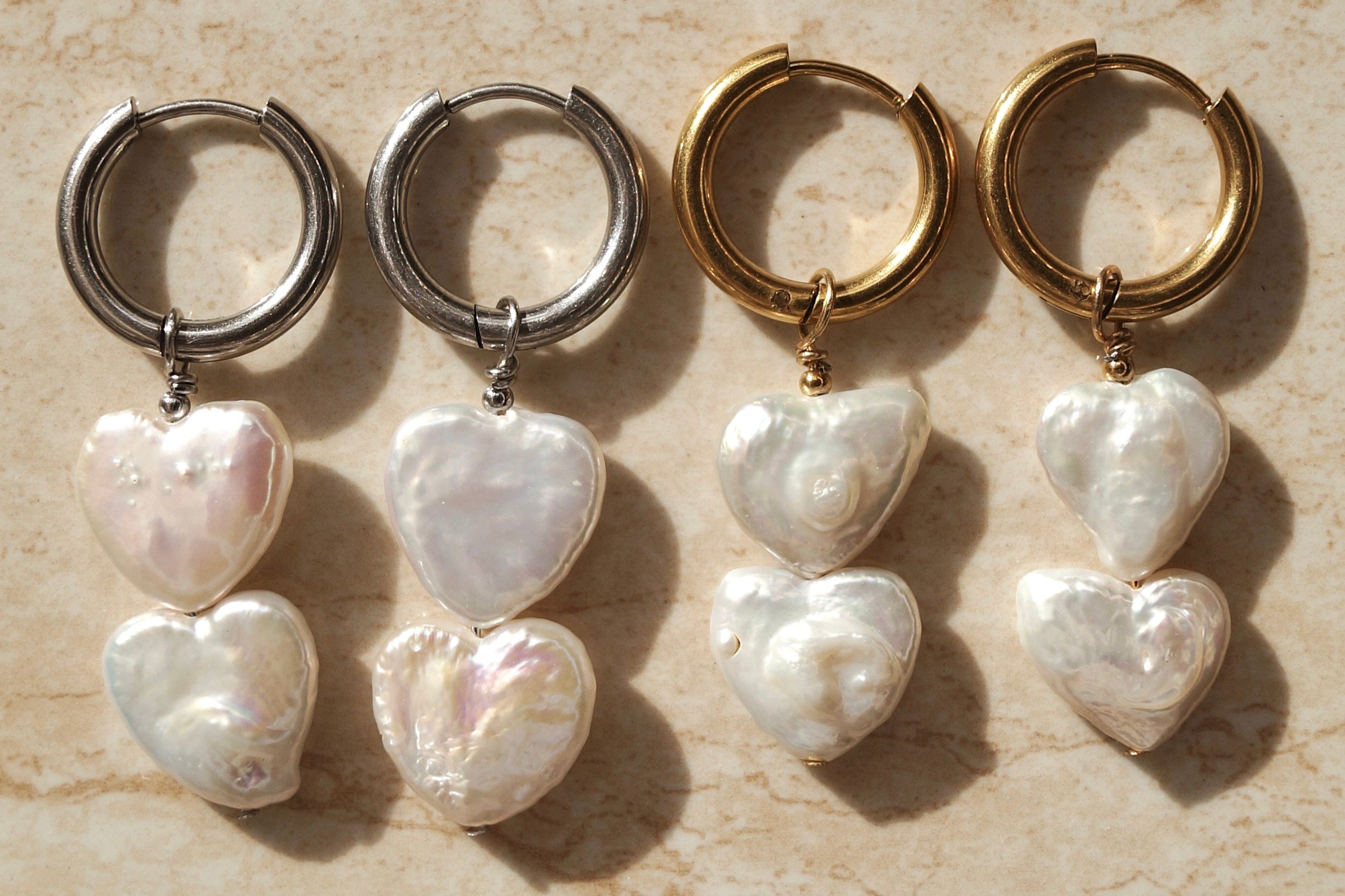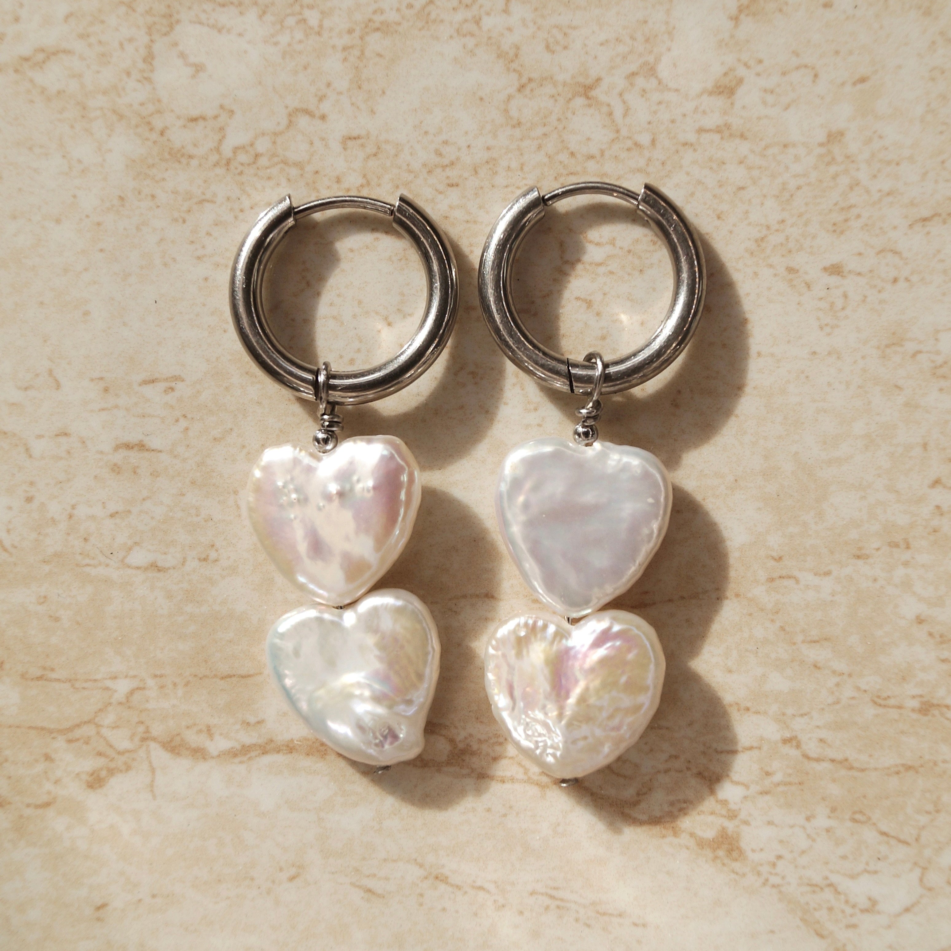 Love is in the air! Deze schattige hartjes zijn subtiel en dus perfect voor elke outfit. Handgemaakt van stainless steel met daaraan 2 natuurlijke zoetwaterparelhartjes.