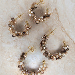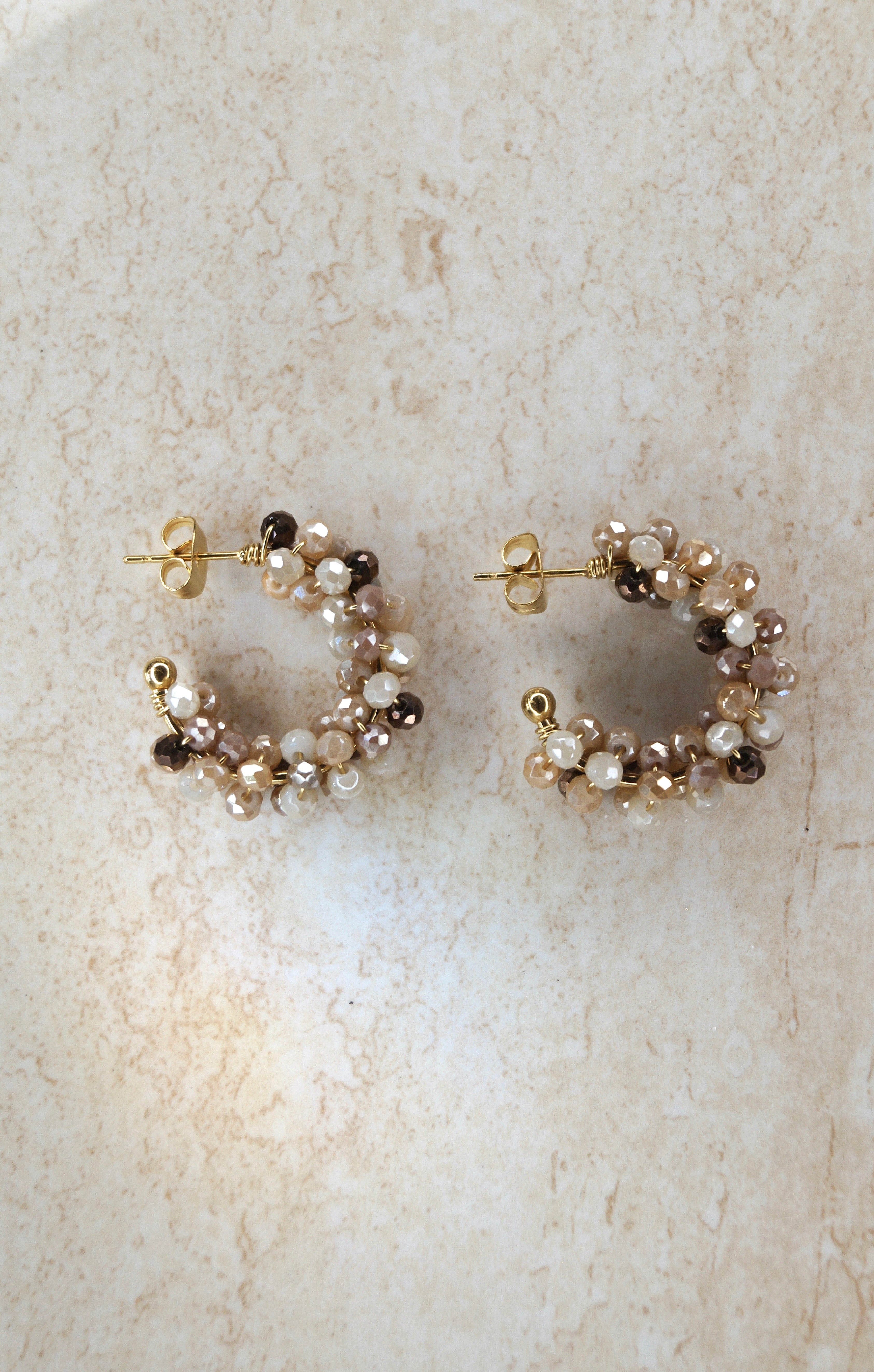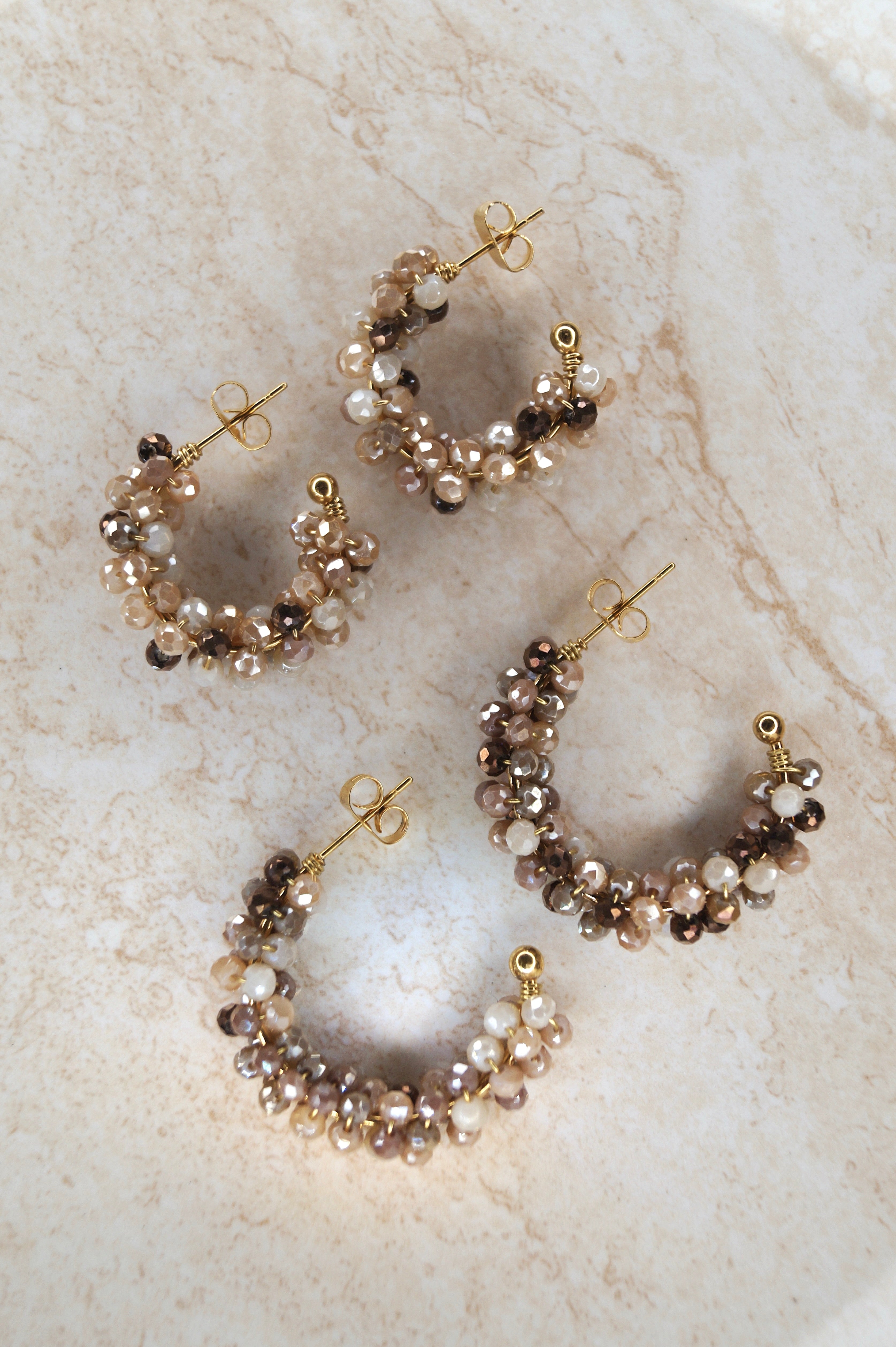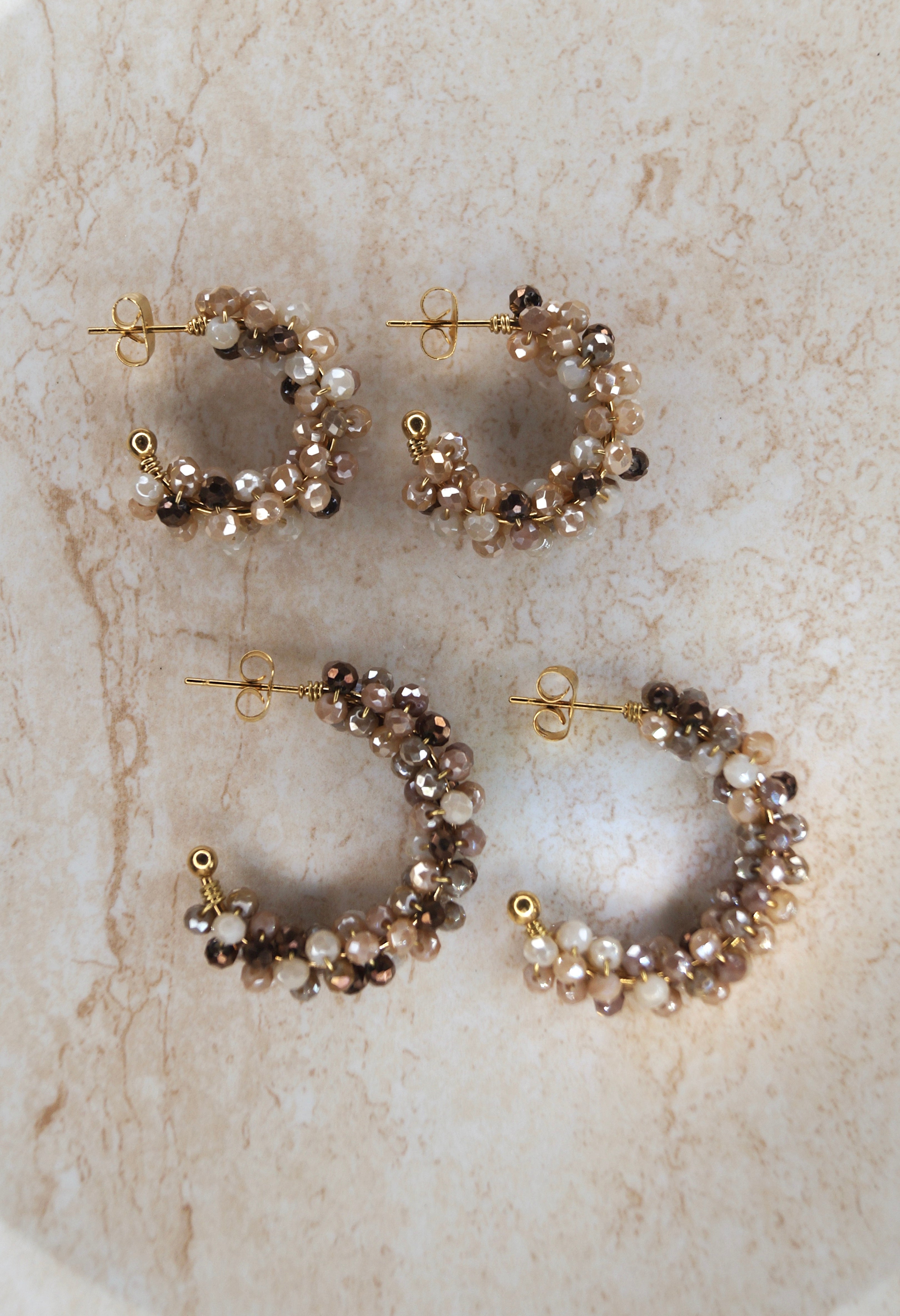Deze handgemaakte oorbellen zijn van stainless steel omringd met hoogwaardige facet kralen in verschillende tinten taupe, beige en grijs.