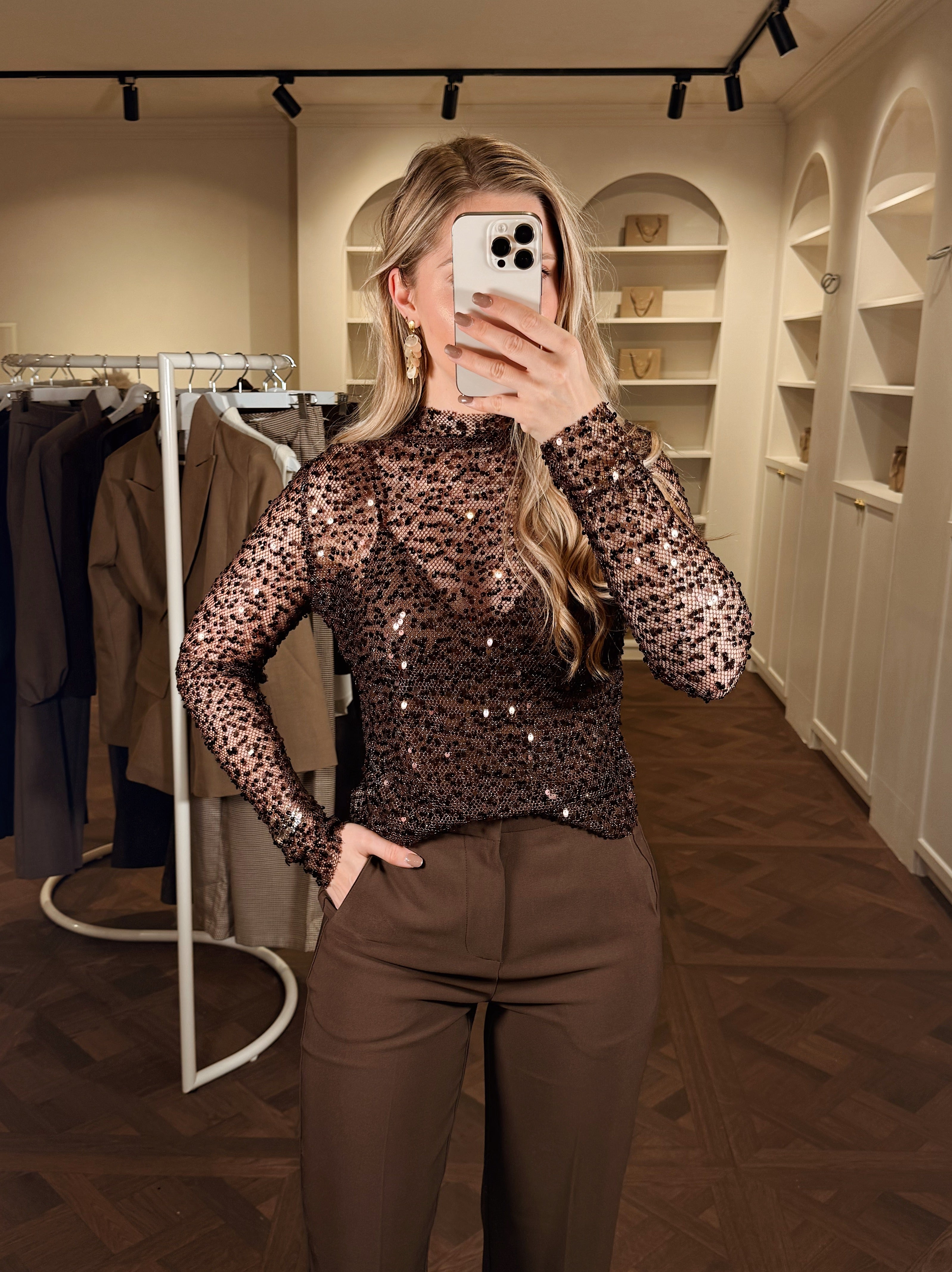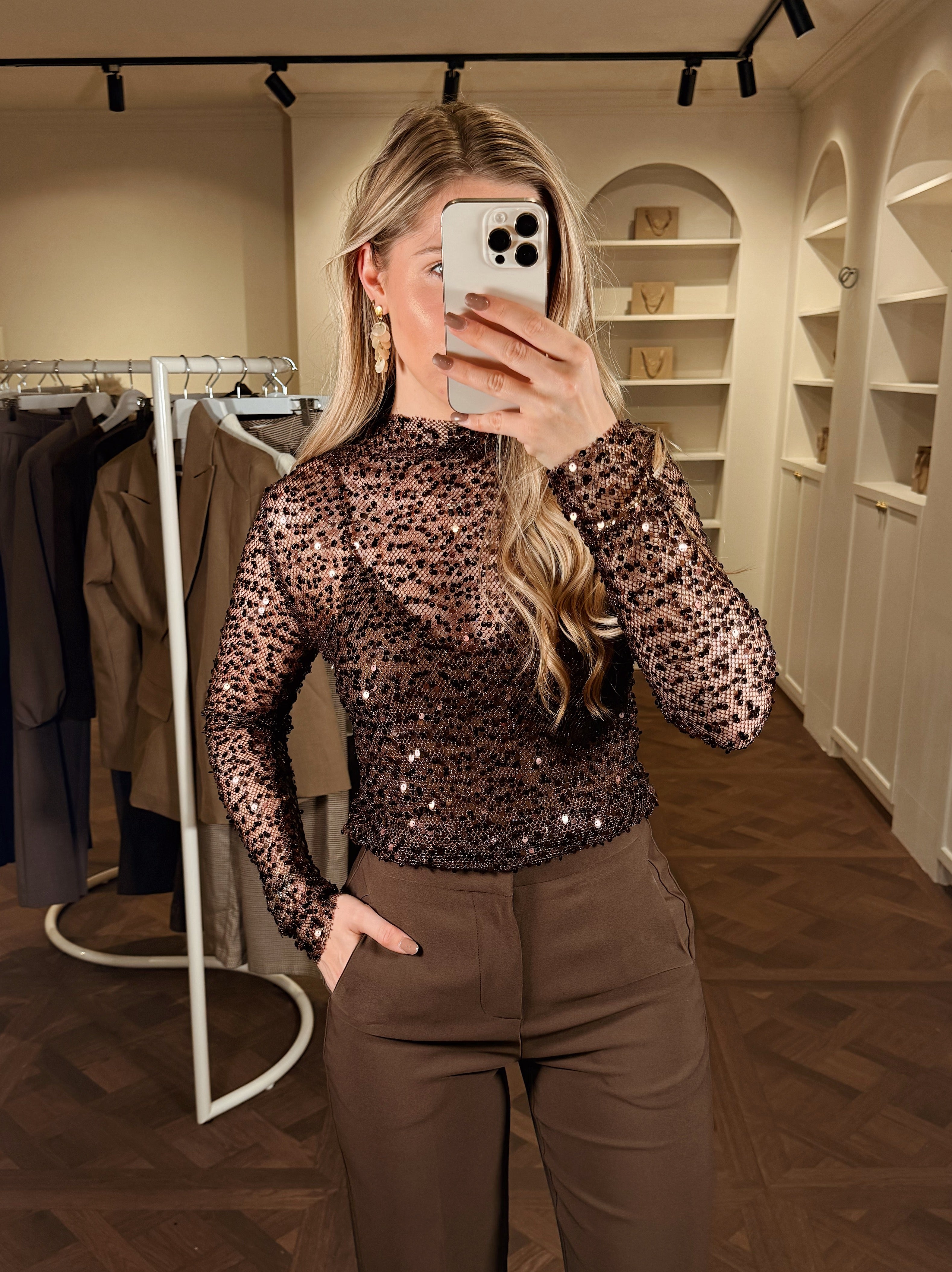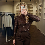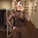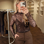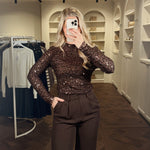 DelenDe Faye Glitter Top is gemaakt om te schitteren. Een rijke chocoladebruine mesh stof met subtiel pailletten, feestelijk én elegant. Combineer met onze Saar Body voor een stijlvolle, dekkende look onder de transparante stof. Perfect voor elke party night.