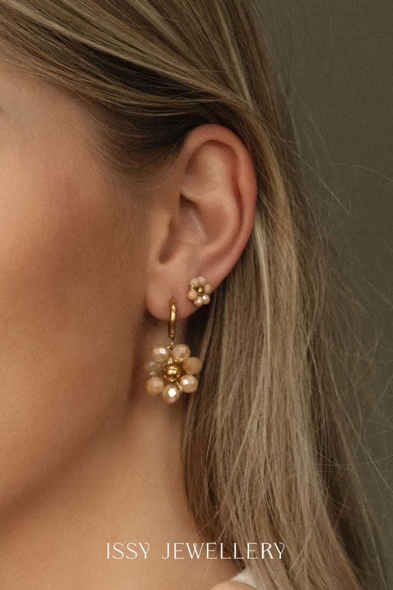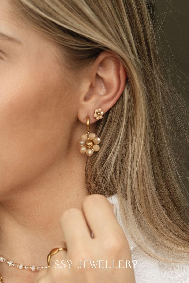 Handgemaakte bloem oorbellen van stainless steel en facetkralen in heel veel verschillende kleuren. Op zoek naar de perfecte combinatie? Combineer de Flower oorbellen dan met de Flower studs.