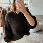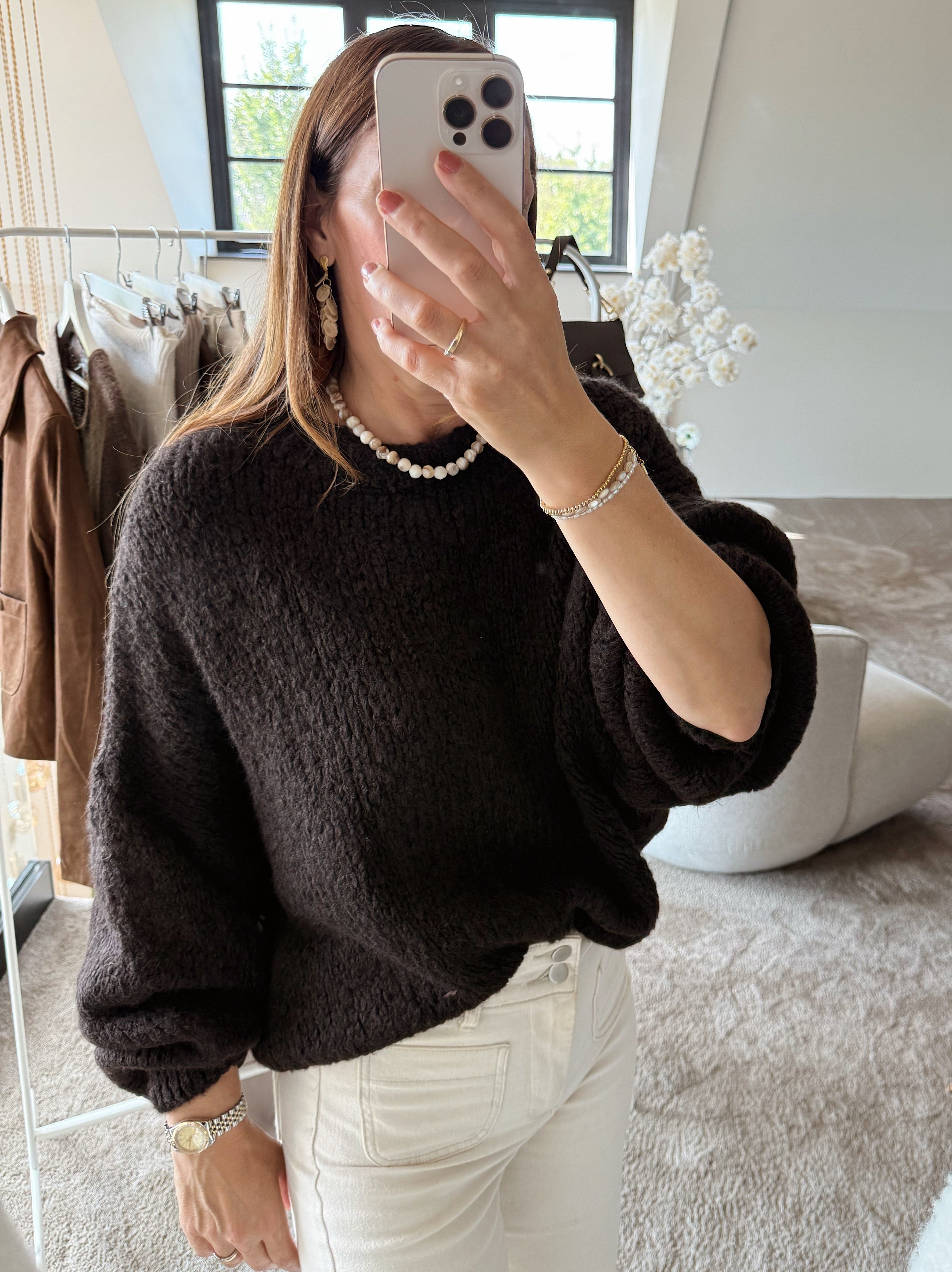 DelenOnze Julie Sweater is een ultiem cosy knit in een diepe donkerbruine kleur. Met het oversized model en de zachte textuur voelt deze trui heerlijk comfortabel aan, terwijl de minimalistische look hem veelzijdig maakt om eindeloos te combineren. Draag ‘m nonchalant op een jeans of elegant over een rok voor een warme en stijlvolle outfit.
