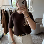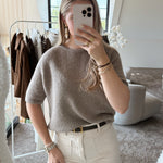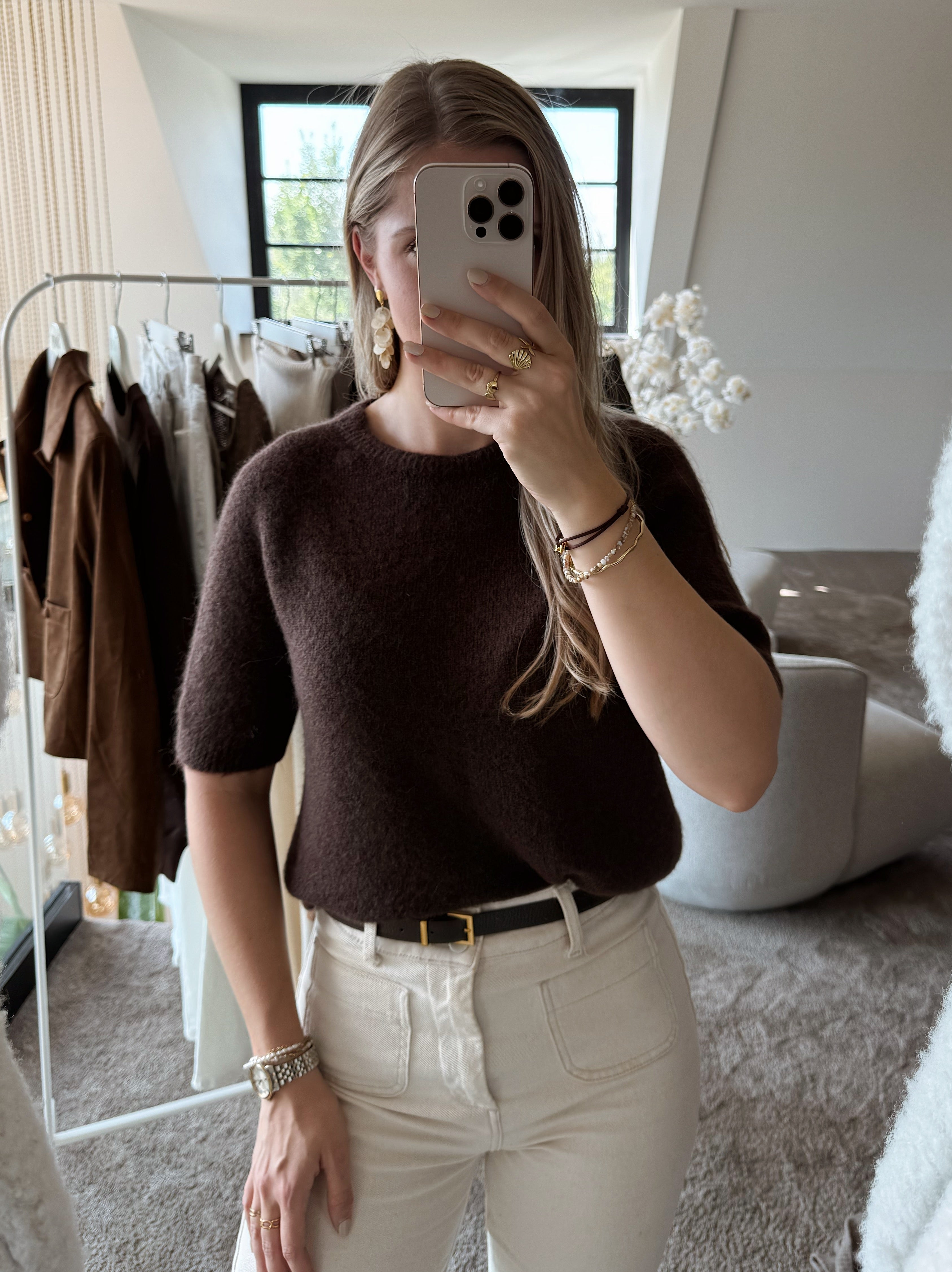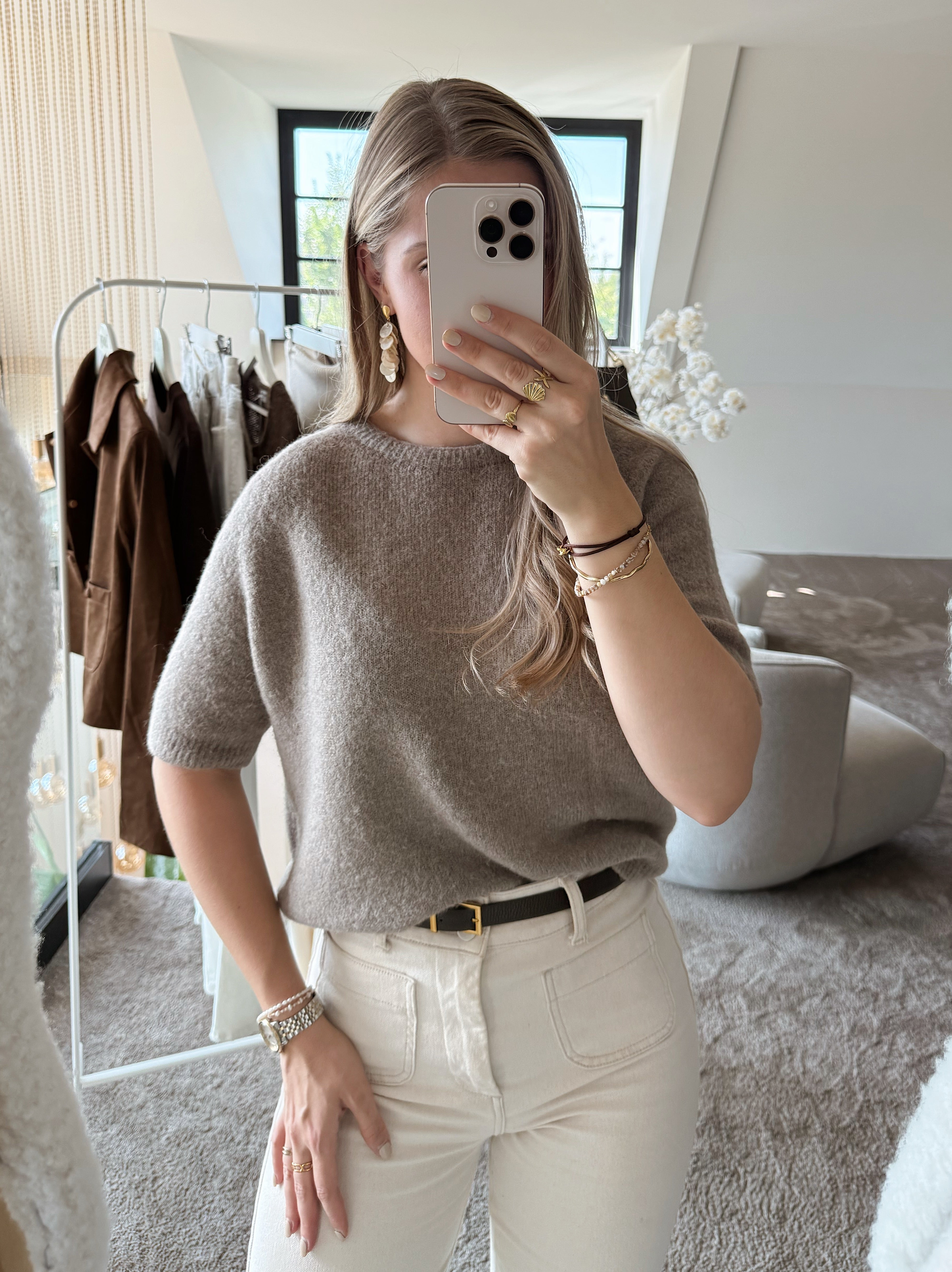 DelenDe Lola Top is een zachte knit met korte mouwen die moeiteloos stijl en comfort samenbrengt. Dankzij de baby alpaca blend voelt de top heerlijk zacht aan en heeft hij een luxe uitstraling. Perfect voor een casual look met jeans of juist chic gecombineerd met een pantalon of rok. Verkrijgbaar in twee tijdloze kleuren: taupe en donkerbruin.