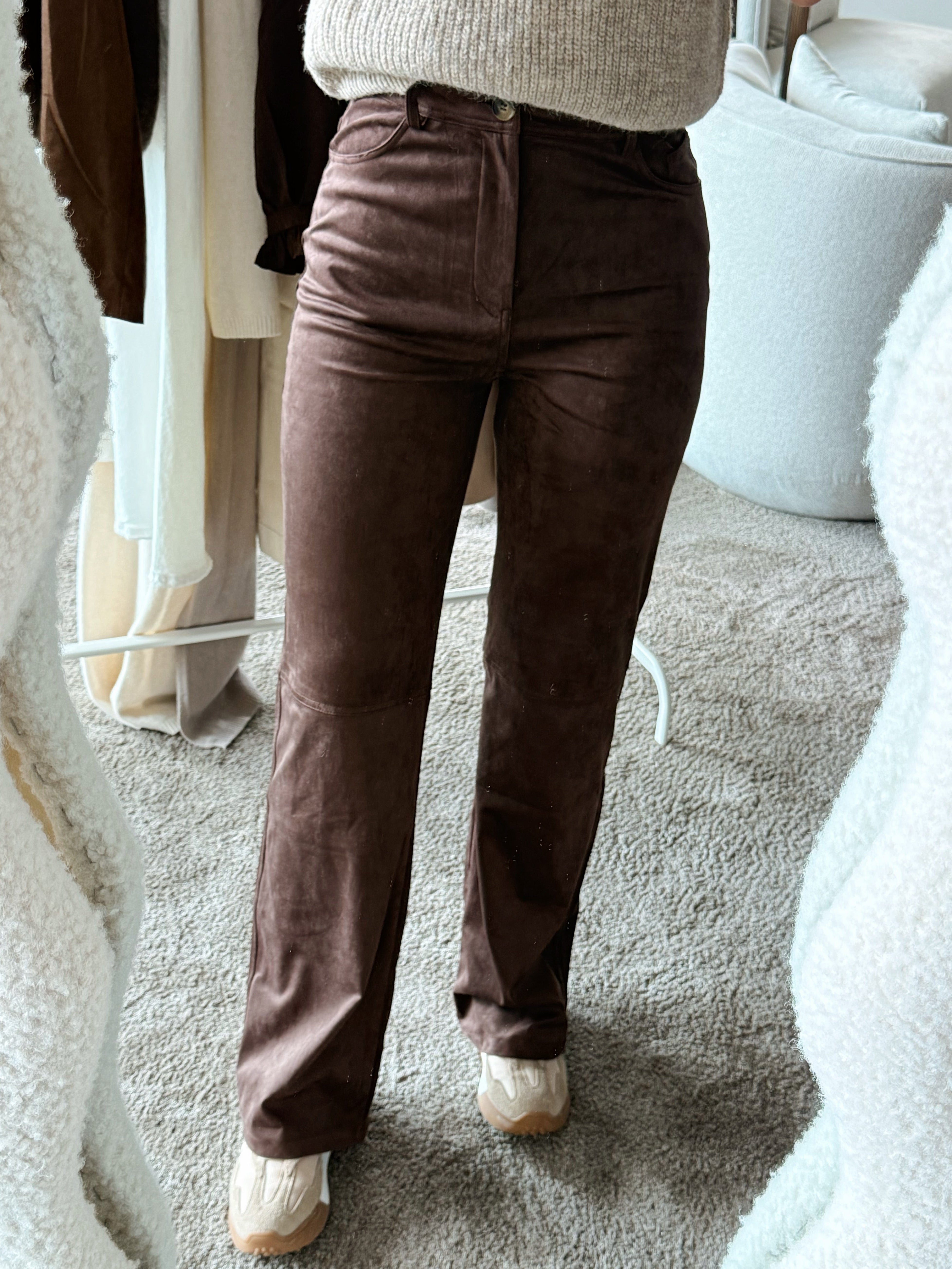 DelenDe Noé Jeans is een stijlvolle broek in een zachte suède look. Dankzij de soepele stof en lichte stretch draagt hij heerlijk comfortabel, terwijl de diepe bruine kleur zorgt voor een chique en moderne uitstraling. Perfect om zowel casual met een knit te combineren als wat gekleder met een blouse of blazer.