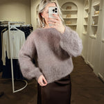 De Nora Knit in de kleur Taupe is gemaakt van een hoogwaardige blend met 80% kid mohair — bekend om zijn uitzonderlijke zachtheid, luchtigheid en warme draagcomfort. De rijke taupe tint geeft je outfit een verfijnde, elegante uitstraling en laat zich moeiteloos combineren met zowel lichte als diepe winterkleuren.