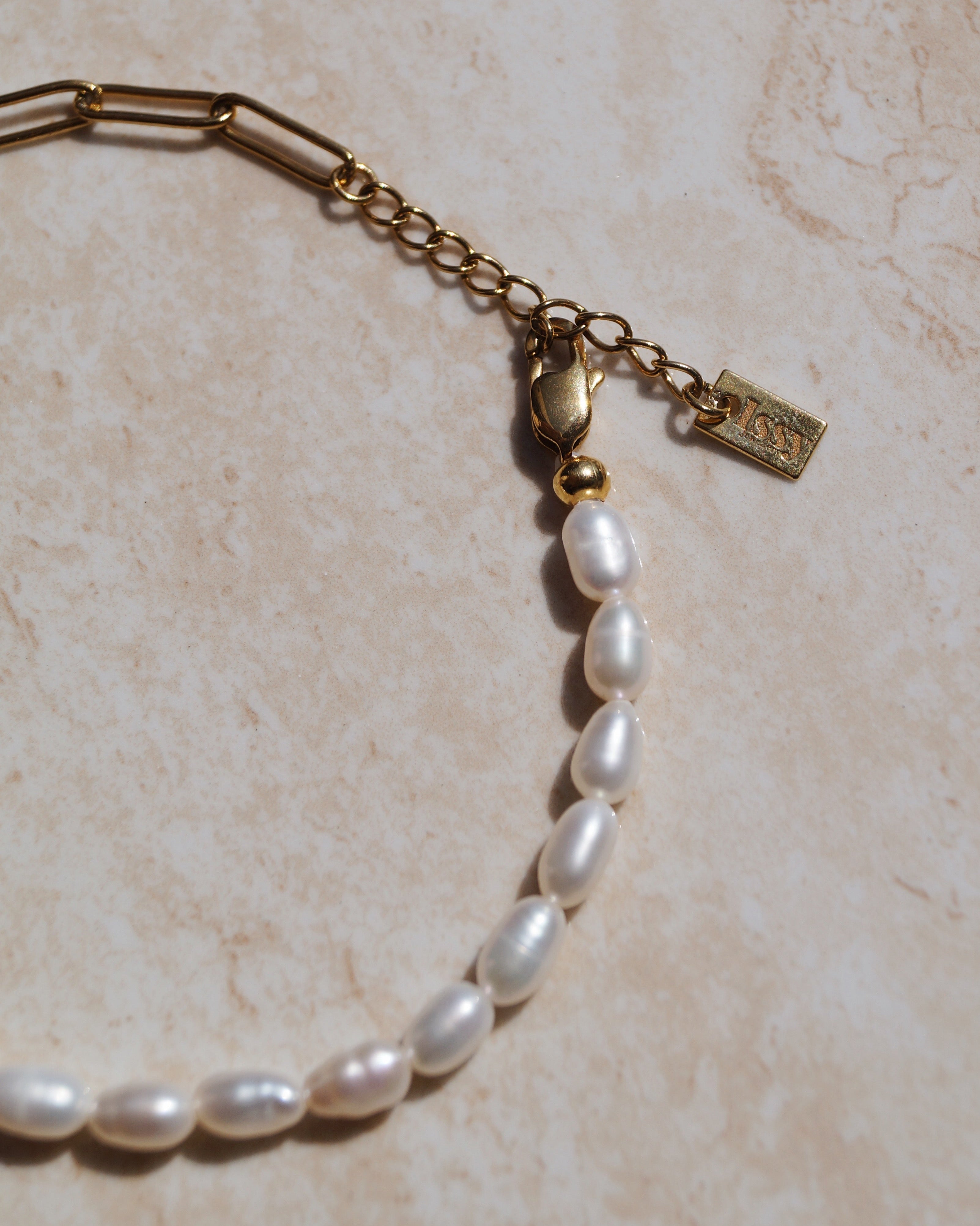 Gemaakt van stainless steel en zoetwaterparels.