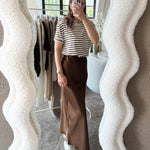 DelenDe Satin Skirt is een elegante rok die luxe en comfort combineert. De satijnlook stof valt soepel langs het lichaam en geeft een verfijnde, vrouwelijke uitstraling. Perfect te dragen met een knit en sneakers voor een casual look of met hakken en een blouse voor een chique avondoutfit.