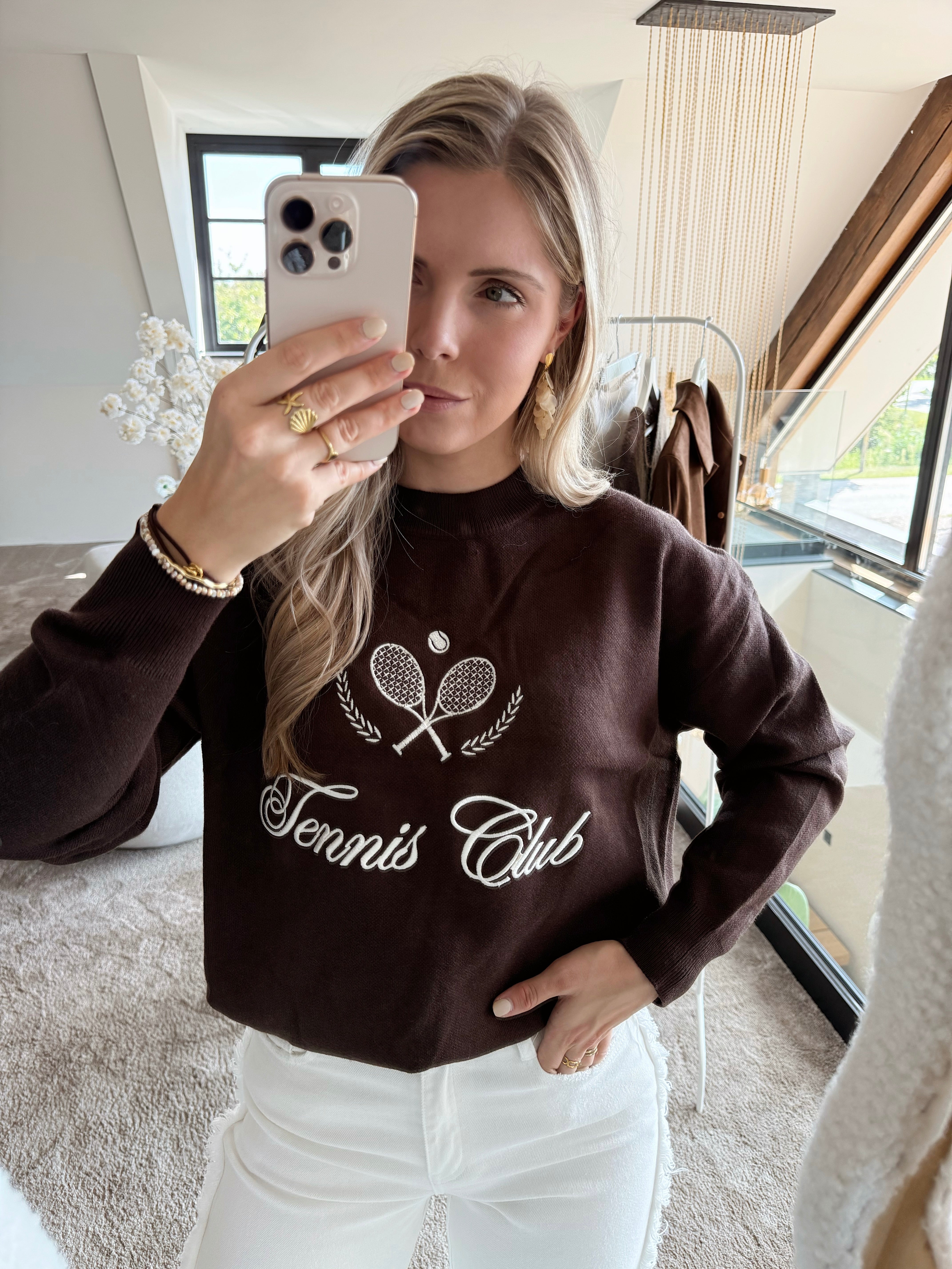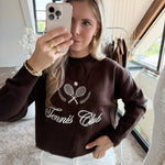 DelenOnze Tennis Club Sweater is een sportief en stijlvol item dat comfort en karakter combineert. De diepe bruine kleur in combinatie met de opvallende witte tennisprint geeft deze sweater een speelse, maar elegante uitstraling. Zit jij ook helemaal in je tennis era? Dan mag dit item niet ontbreken in je garderobe. Combineer op jouw favo tennis rokje voor op de baan, of op onze Rosa jeans voor een casual chique look.