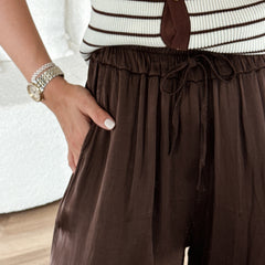 Onze Viva Pants combineert moeiteloze elegantie met ultiem comfort. De soepel vallende stof heeft een subtiele glans en heeft een diepe, rijke bruine kleur. Dankzij de elastische tailleband met koordje sluit de broek prettig aan, terwijl de losvallende pijpen zorgen voor een luchtige, chille fit. Draag ‘m casual met een basic top of netjes gekleed met een blouse.